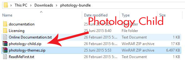 After downloading Photology package from Themeforest you need to extract those file, and then you will find zip file with name like photology-child.zip . This is child theme file of Photology Themes.