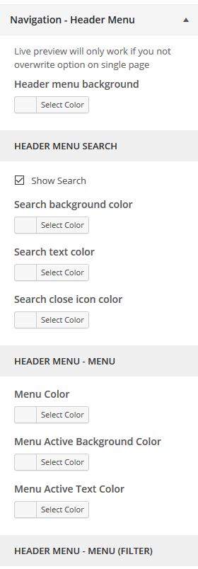 From customizer you able to change setting of your navigation header menu. From background, color option, until show / hide search.