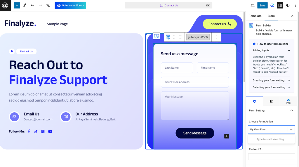 Configuring the form action is a crucial step if your FSE theme includes a contact form. This setting specifies the destination where form data will be sent and processed when users submit their information.