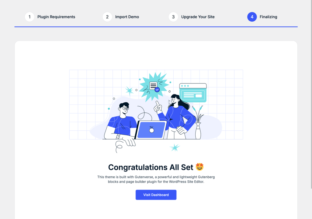 On this final page, click the “Visit Dashboard” button to be redirected to the FSE theme dashboard.
