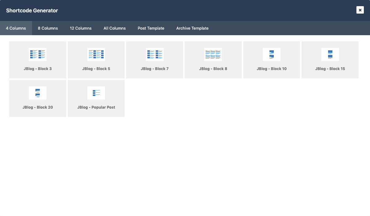 We also have a shortcode generator feature that you can use to generate the shortcode elements of JBlog Elements. Please check the following images below: