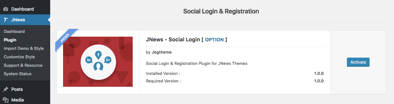 To enable social login & registration on your website, you just need to install JNews – Social Login & Registration plugin. You can easily install and activate this plugin from Plugin Dashboard by go to JNews Dashboard → Plugin