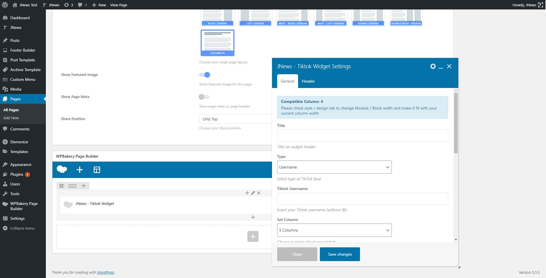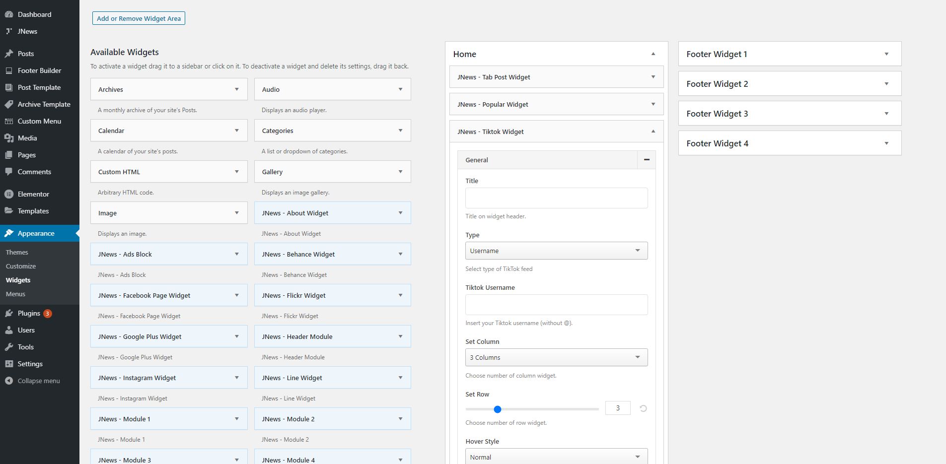 For Footer Tiktok Feed, you can access it by going to JNews DashboardCustomize StyleJNews : Social, Like & ViewTikTok Feed Setting. Meanwhile for TikTok widgets, you can add it to the WordPress widget area. You can also add TikTok widget using elements in WPBakery and Elementor.