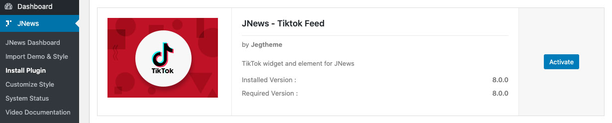 To enable TikTok Feed on your website, you just need to install JNews – TikTok Feed plugin. You can easily install and activate this plugin from Plugin Dashboard by go to JNews Dashboard → Plugin