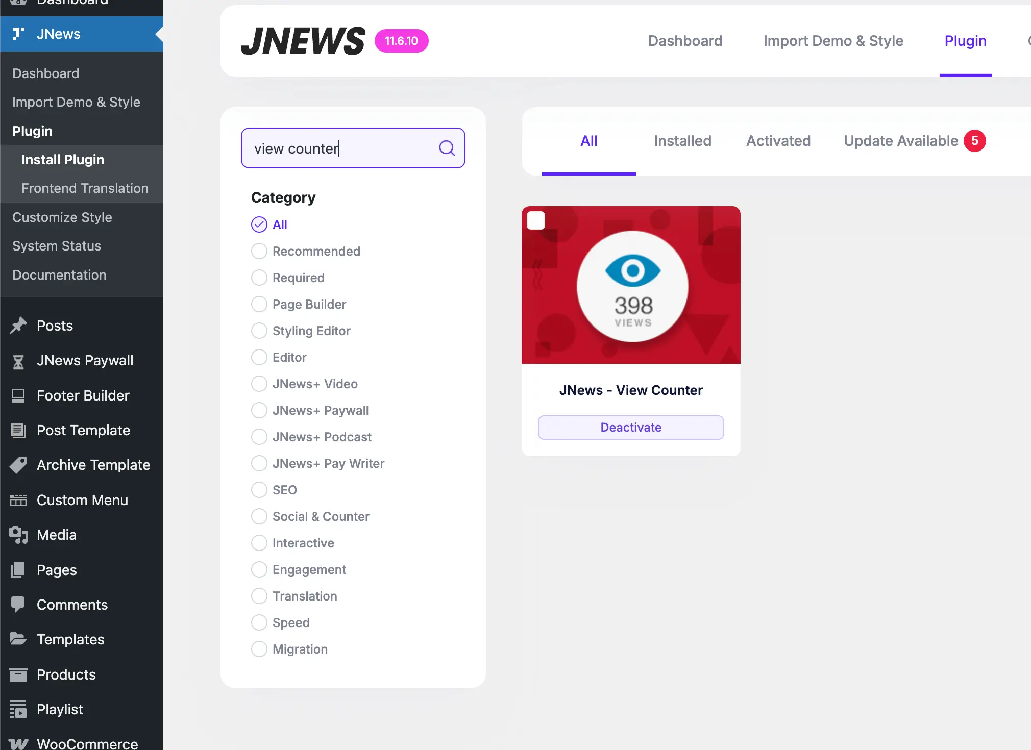 To enable the view counter feature on your website, you just need to install JNews – View Counter plugin. You can easily install and activate this plugin from Plugin Dashboard by going to JNews DashboardPlugin