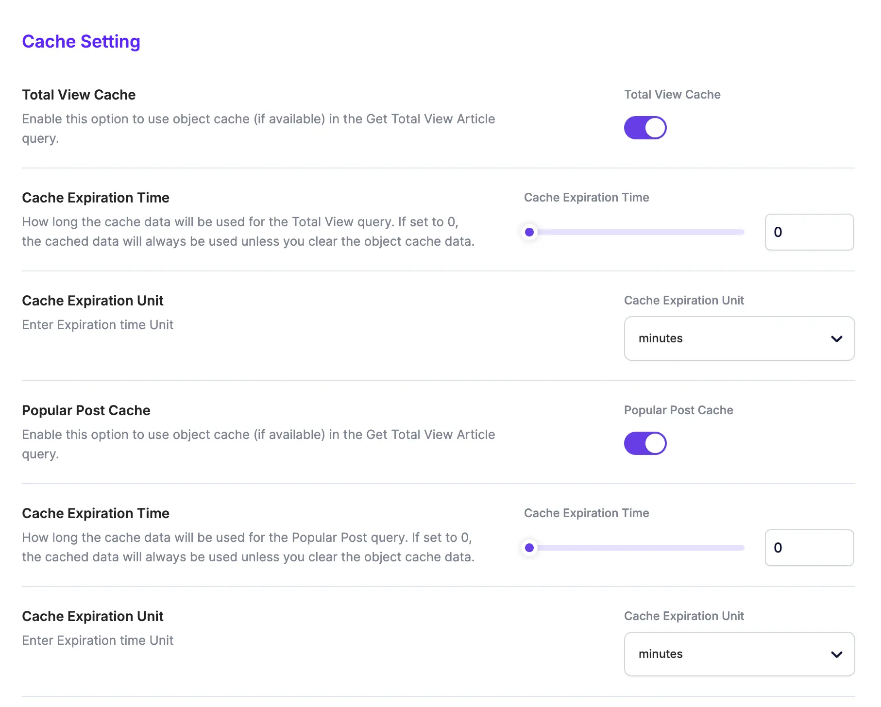 How long the cache data will be used for the Popular Post Query. If set to 0, the cached data will always be used unless you clear the object cache data.
