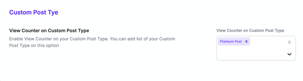 To enable View Counter on your Custom Post Type. You can add list of your Custom Post Type on this option