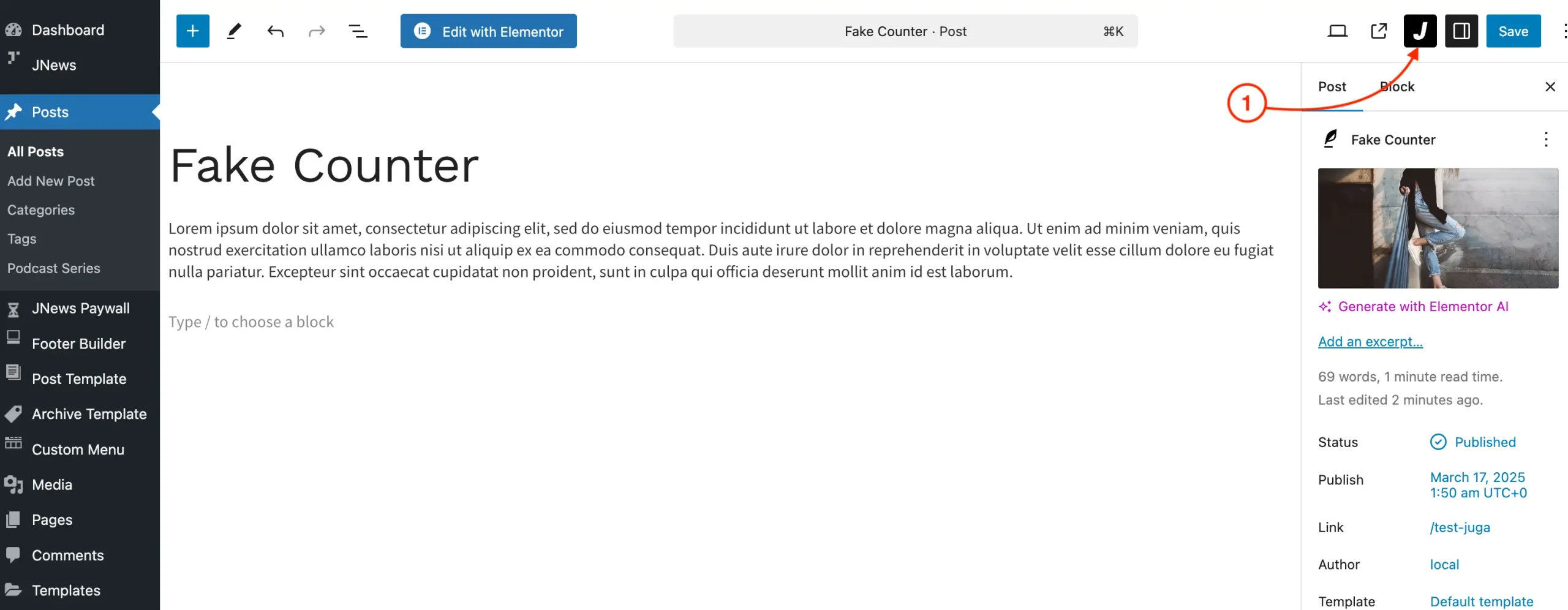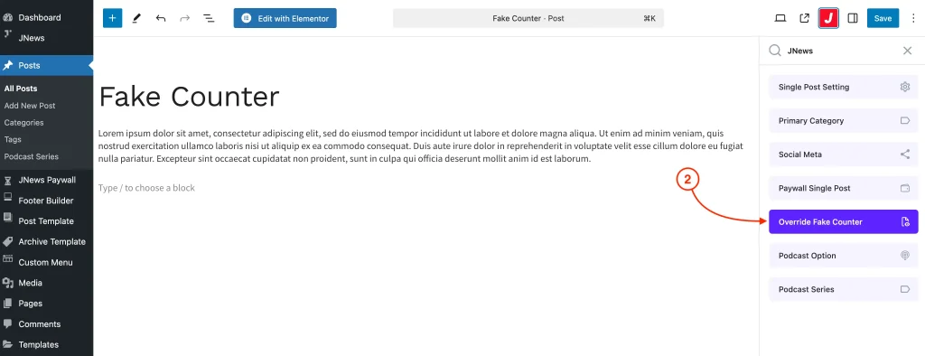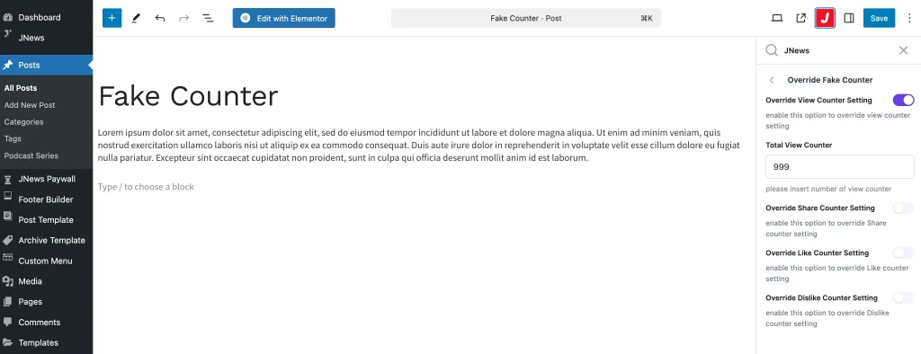 The JNews – View Counter plugin adds the Override Fake Counter option in the single post settings, allowing authors to set a fake counter value for the number of Views, Shares, Likes, and Dislikes of the post. You can access this option through the menu JNews Metabox Override Fake Counter . If you are using the Classic Editor, you can refer to the following documentation on how to change it.