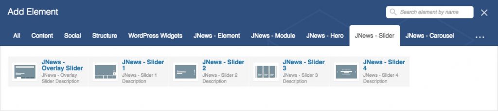 As you can see on the image below, on JNews – Slider group tab we provide several Visual Composer element that you can use.