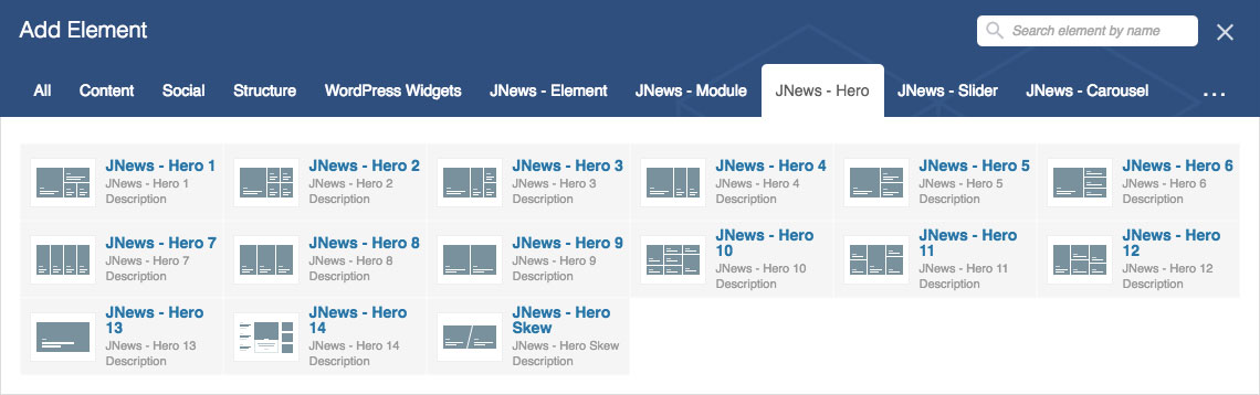 As you can see on the image below, on JNews – Hero group tab we provide several Visual Composer element that you can use.