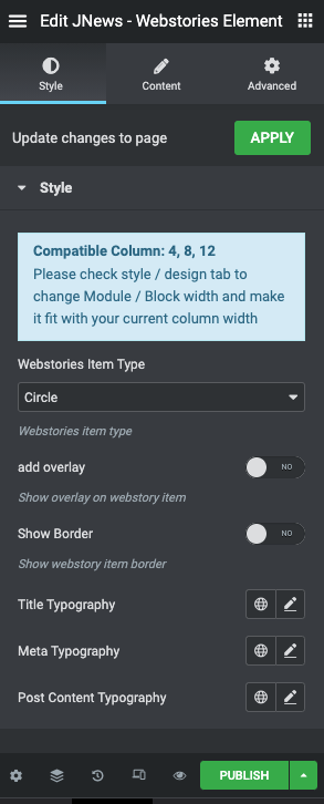 - after you select the webstories element, webstories element settings will appear, from the settings you can adjust your webstories element settings there
